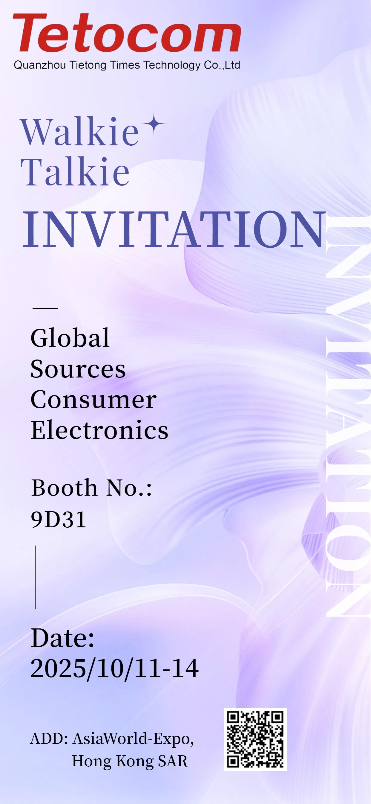Quanzhou Tietong Times Technology Co., Ltd. is set to debut at the 2025 Global Source Consumer Electronics Show (Oct 11-14) at AsiaWorld-Expo, Hong Kong. Visit us at Booth 9D31 to explore our full-range two-way radio solutions tailored for global industries.